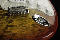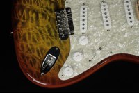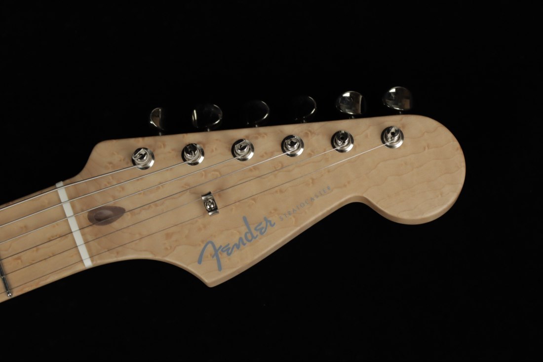 This particular Stratocaster is crafted from absolutely stunning tonewoods: an ultra-lightweight select ash body, a flamed AAAAA maple top, and a 5A Birdseye maple neck. Even unplugged, it vibrates with remarkable liveliness—while in the hands, it feels like a feather.