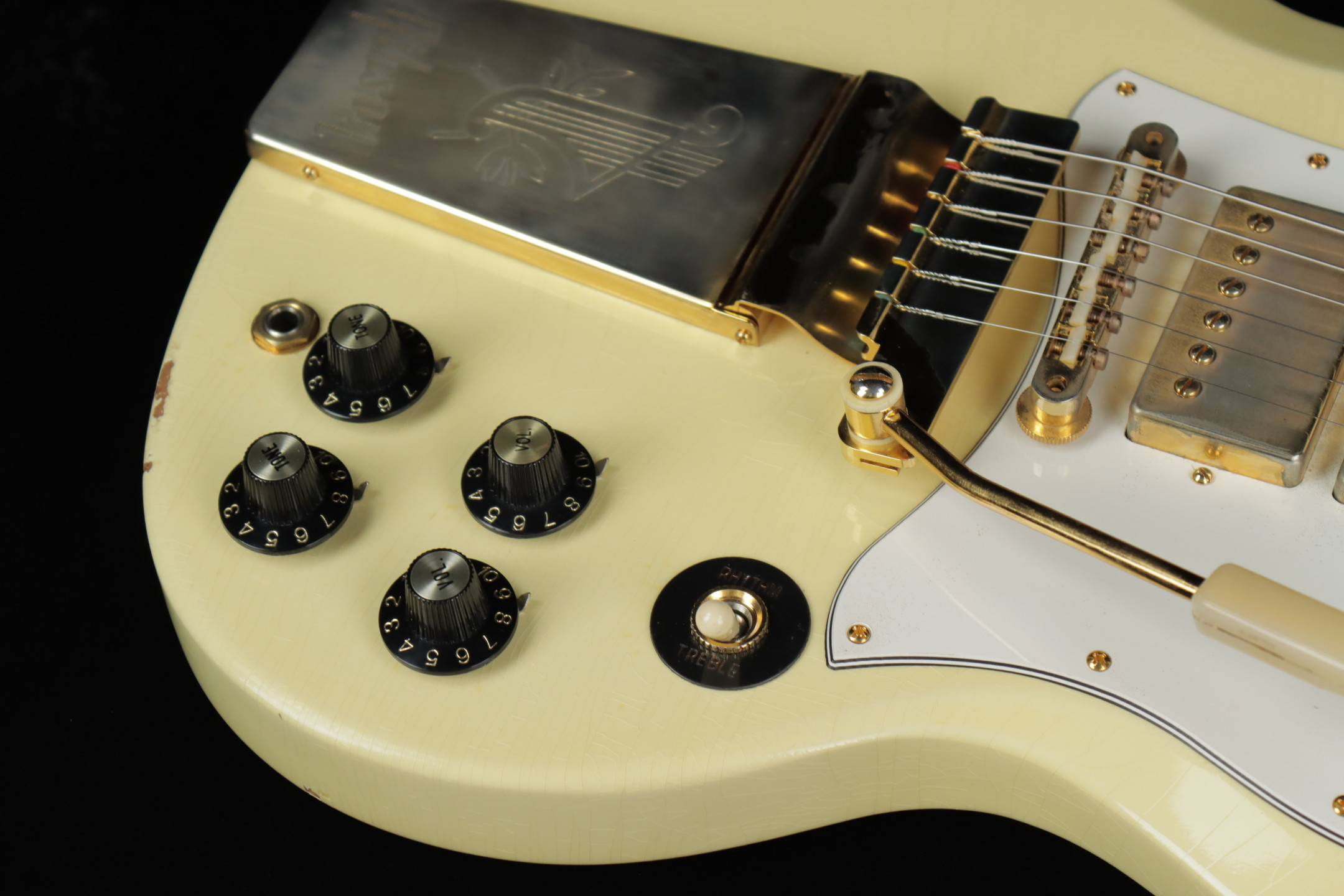 Jimi Hendrix is widely regarded as the most innovative guitarist of the rock era. This limited edition Gibson Custom Shop 1967 SG™ Custom accurately replicates the right-handed guitar (strung lefty) that Hendrix played on The Dick Cavett Show on September 9, 1969 – one of Jimi’s rare television interviews and performances. This SG Custom features a Murphy Lab Aged Polaris White finish and aged gold hardware.
