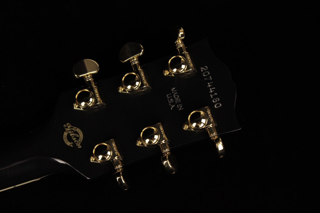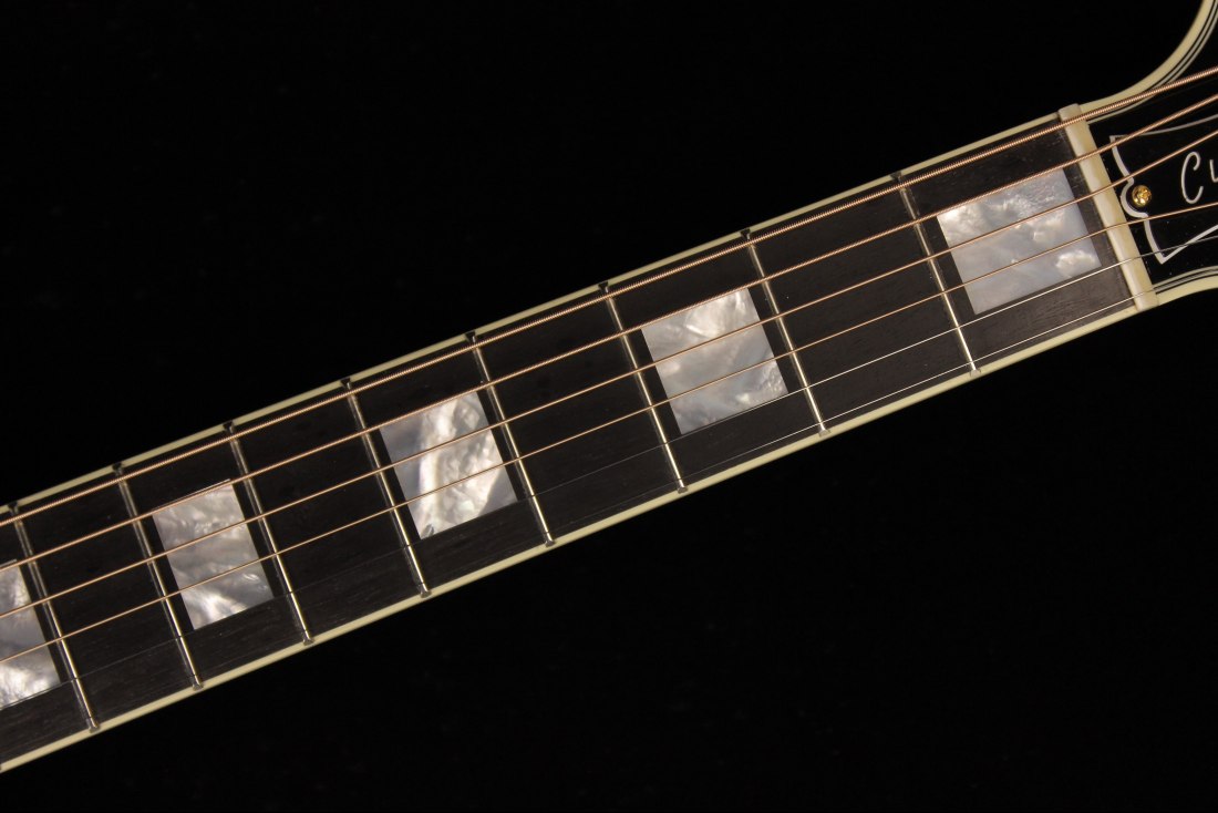 The J-45 Custom takes things to the next level with Les Paul™ Custom-inspired cosmetics, including an Ebony nitrocellulose lacquer finish, multi-ply binding on the top and back, a bound Les Paul-style peghead with a Custom split diamond inlay in mother of pearl, a bound ebony fretboard with mother of pearl Custom Block inlays, and gold Grover® Rotomatic® tuners. It comes equipped with L.R. Baggs™ Session VTC electronics and a hardshell case.
