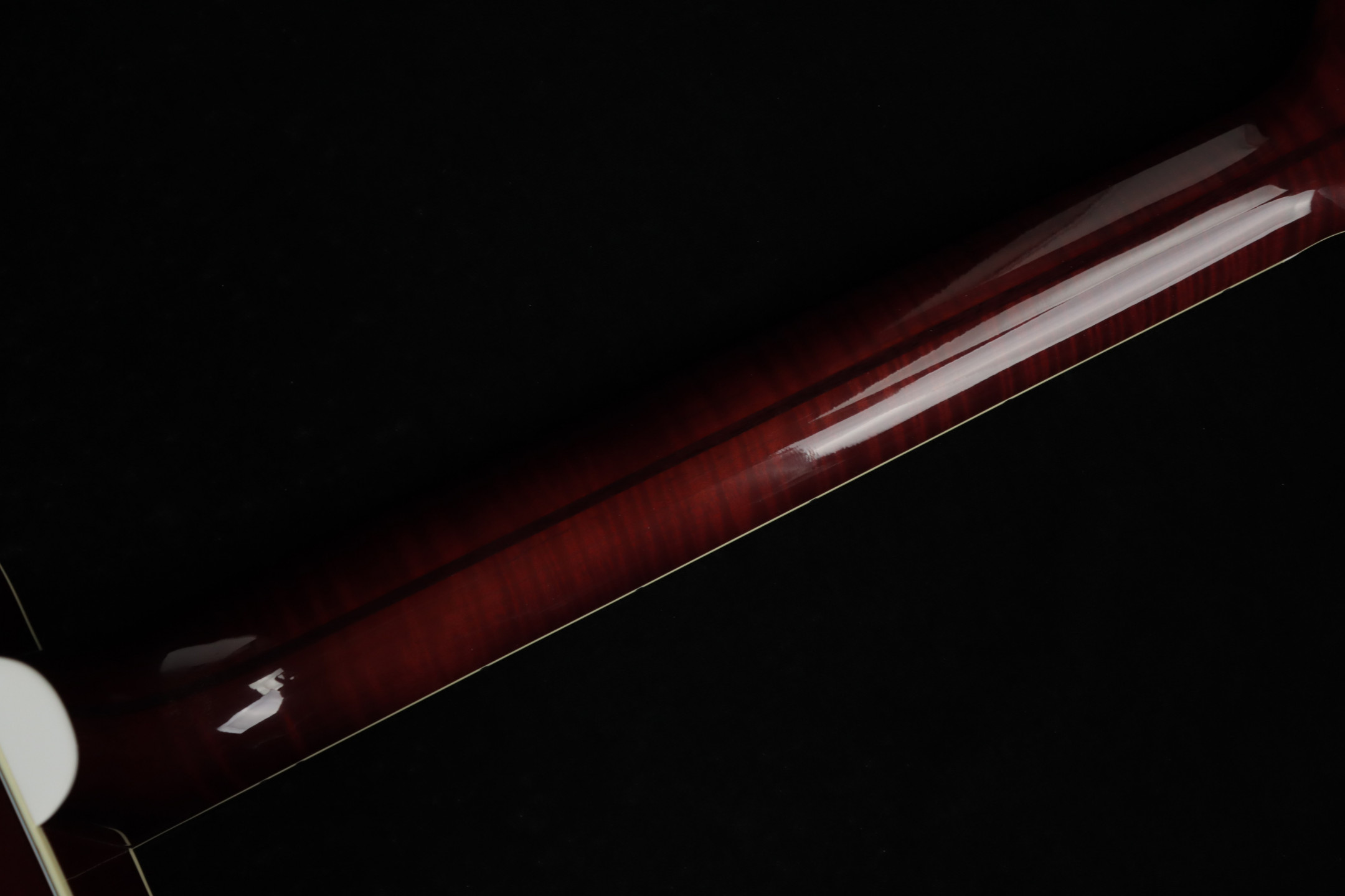 The materials used are top-notch, featuring solid Sitka spruce for the top, solid flamed maple for the back and sides, and rosewood for the bridge and fingerboard.