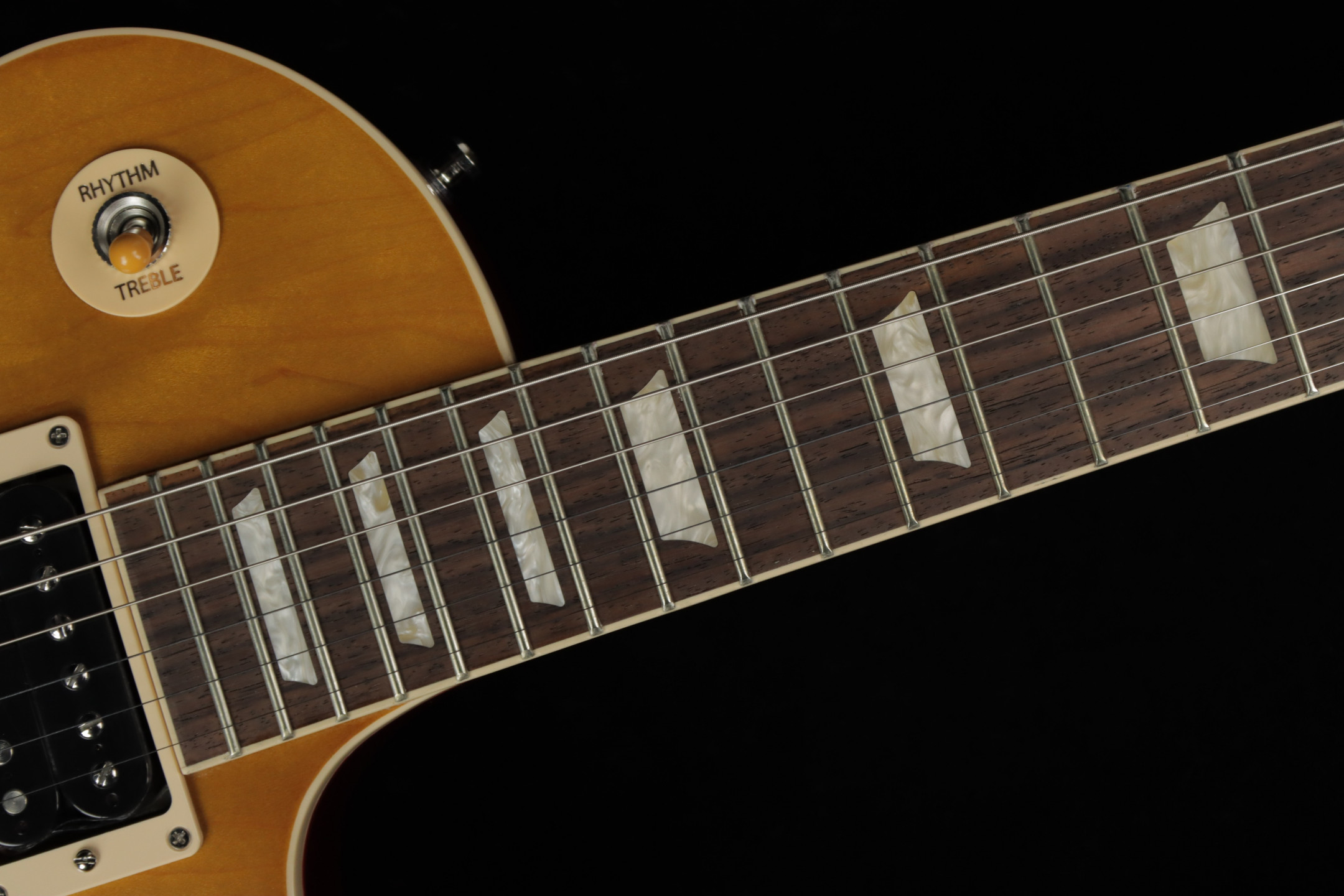 Originally a bright Cherry Sunburst, Slash had Jessica refinished, which is reflected, minus the considerable road wear on the original, in the gloss nitrocellulose Honey Burst with Red Back finish used on the new model.
