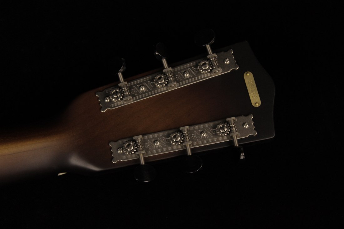National guitars are available in various configurations, with subtle differences between models enhancing their playability and sound. This 12-fret model, for instance, features a slotted headstock and flat-cut F-holes, setting it apart from the 14-fret version, which boasts a solid peghead and rolled F-holes. Both models share a consistent dedication to quality, with an interior finish to prevent rust, ensuring longevity without compromising on tone.