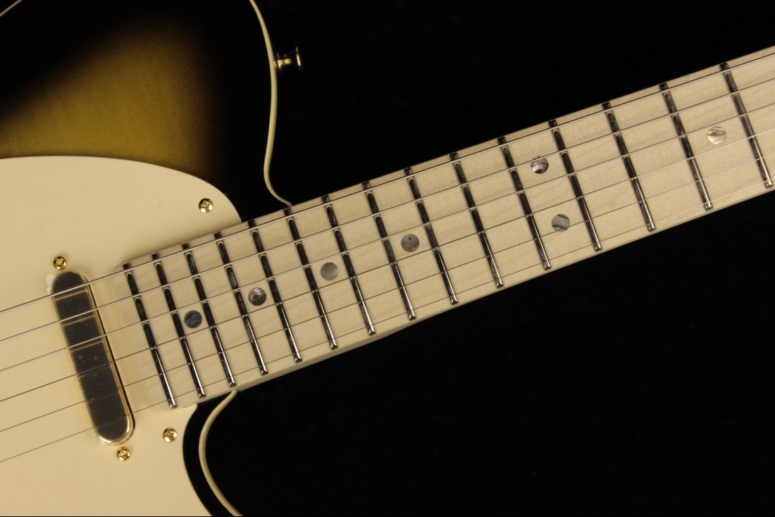 Other premium features include a satin-finish maple neck with a large “C”-shaped profile, 12”-radius maple fingerboard with 22 jumbo frets and pearloid dot inlays, three-way blade pickup switch with “barrel” tip, master volume control and rotary series/parallel switch, single-ply cream pickguard, gold six-saddle through-body Telecaster bridge, Gotoh® sealed tuners and gold hardware.