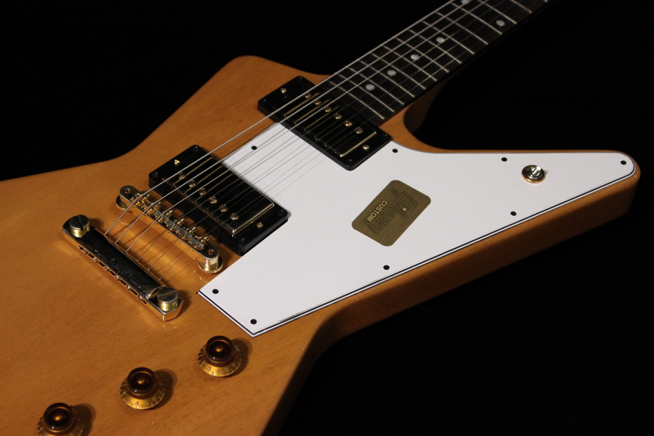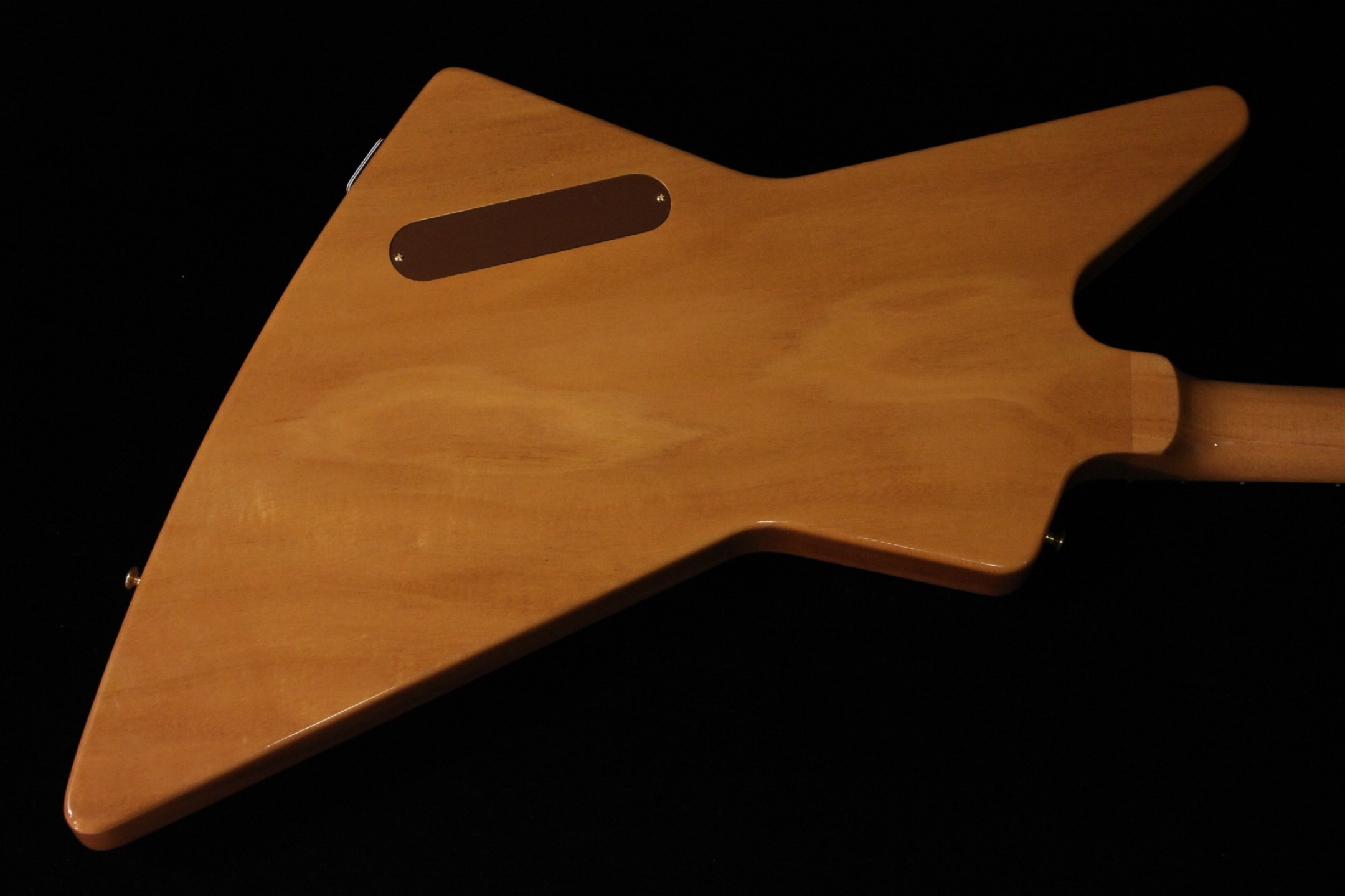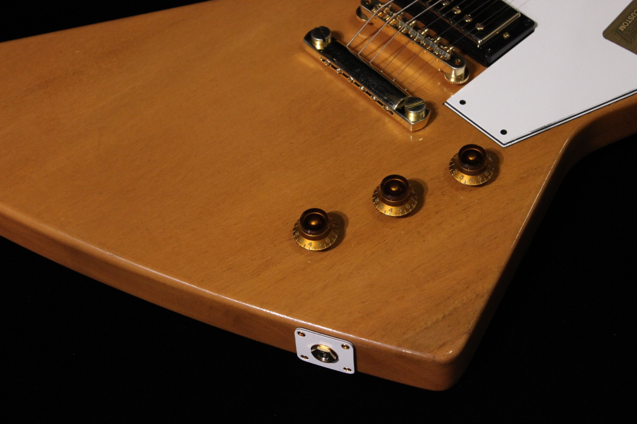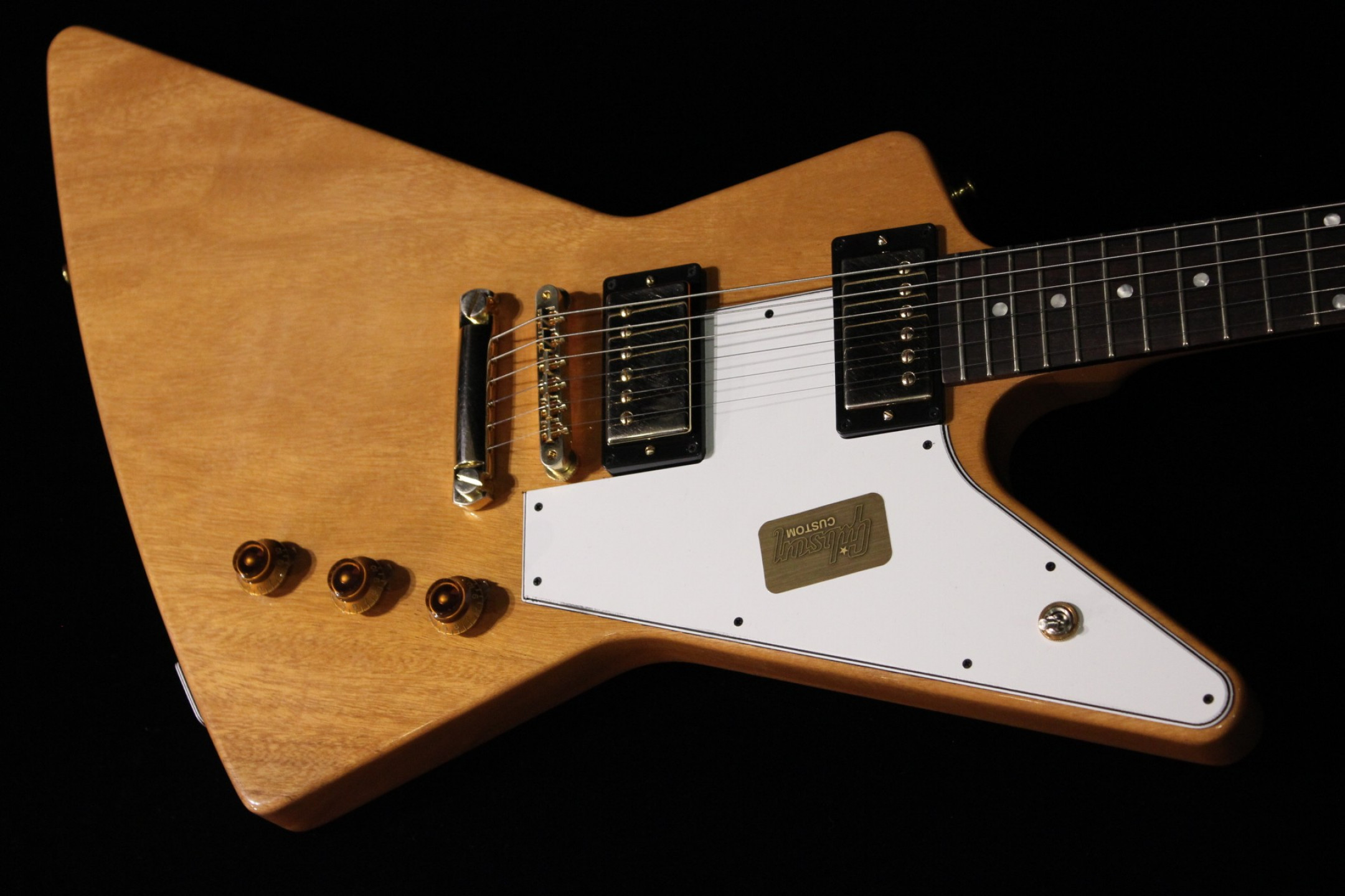 Historically accurate reproduction of a 1958 Gibson Explorer, with mahogany replacing the original korina for the body and neck. The guitar is hand-finished in VOS (Vintage Original Spec) to give the look of a new guitar, some decades old, that has been stored and played very little.