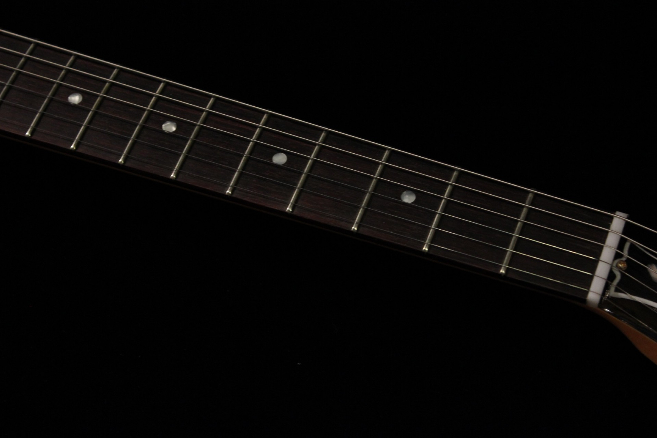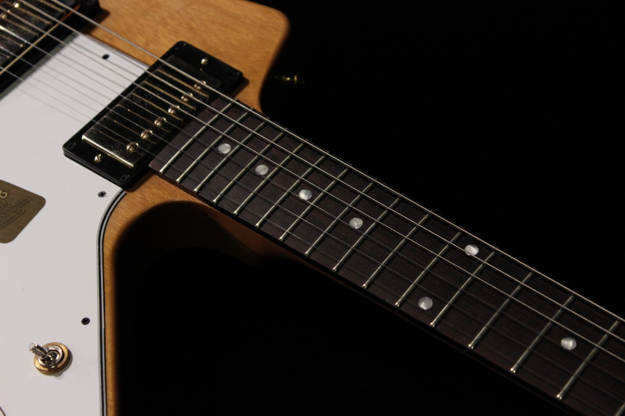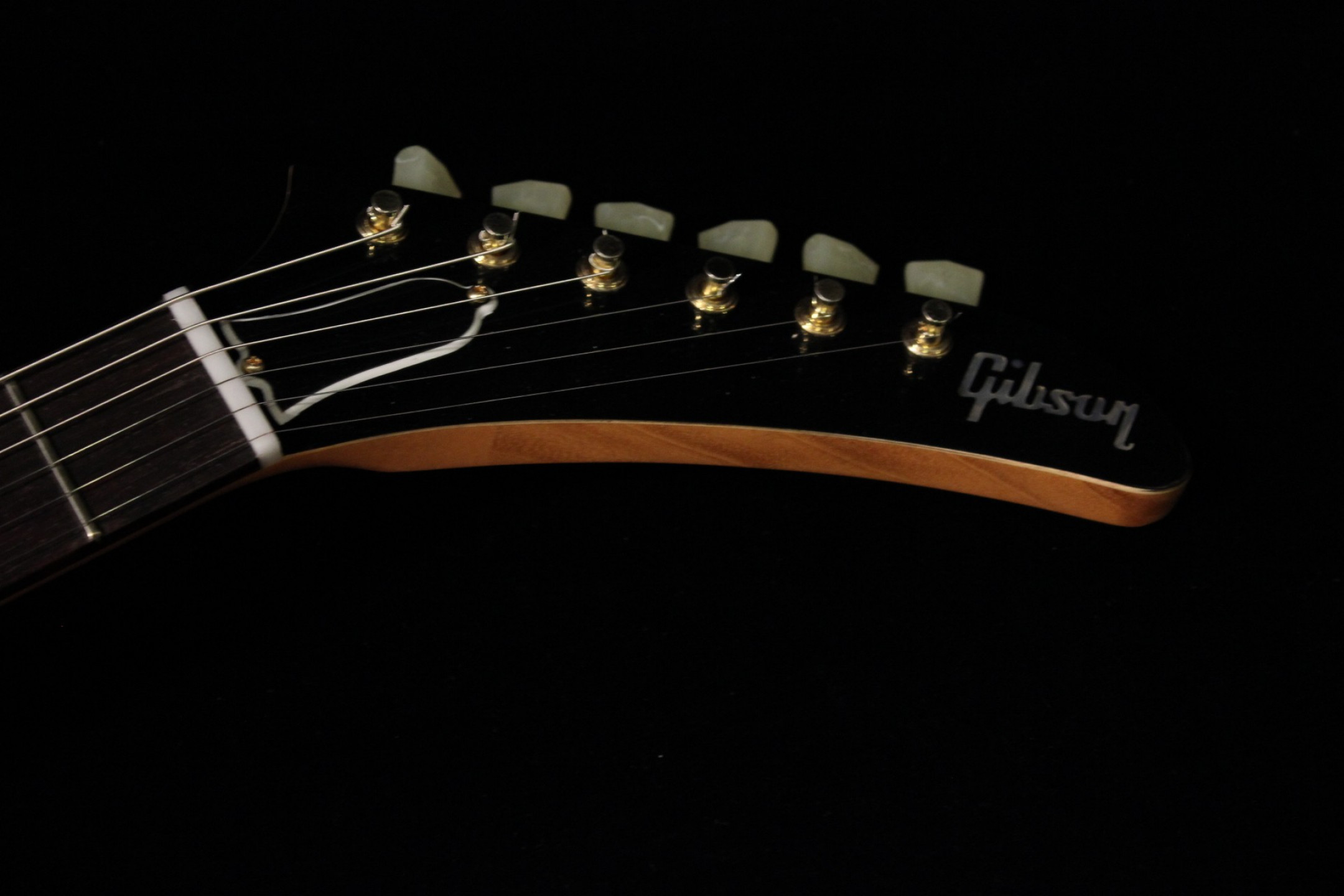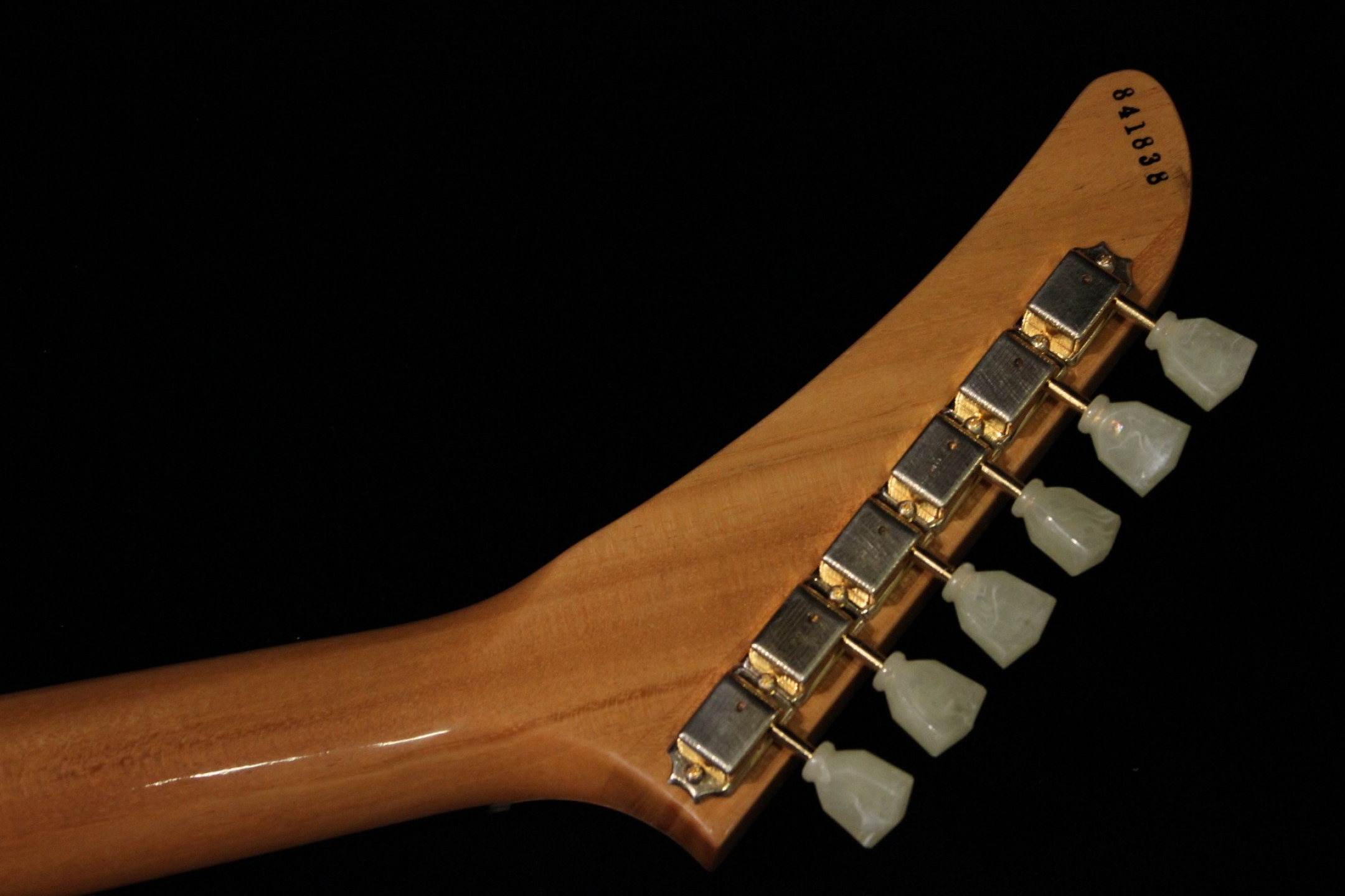 Historically accurate reproduction of a 1958 Gibson Explorer, with mahogany replacing the original korina for the body and neck. The guitar is hand-finished in VOS (Vintage Original Spec) to give the look of a new guitar, some decades old, that has been stored and played very little.