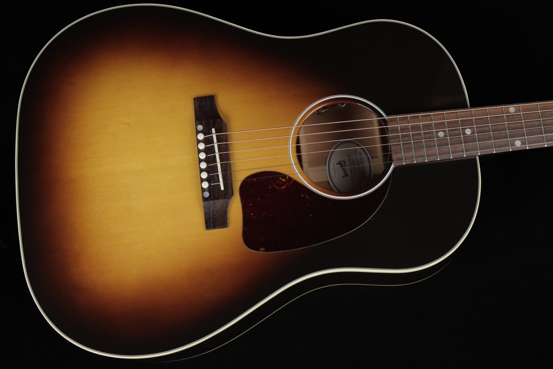 Part of the J-45's reputation is its iconic appearance; the alluring vintage sunburst finish and 'tortoise teardrop' pickguard are picture perfect.